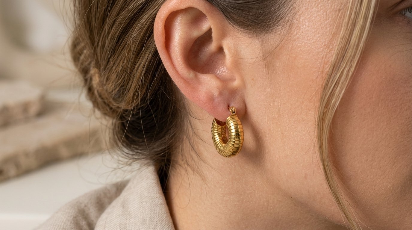 Elevate your everyday style with The Aurelia Ribbed Gold Croissant Hoops. Inspired by classic vintage designs, these chunky hoop earrings feature a distinctive ribbed texture that catches the light from every angle, adding a touch of sophisticated glamour to any outfit. Crafted with a radiant gold-tone finish, their lightweight design ensures all-day comfort without sacrificing that coveted statement look. Whether you are dressing up for a chic night out or adding a polished finish to your casual weekend wear, these versatile hoops are the perfect staple piece. Secure hinged closures provide a seamless fit for effortless, confident wear.