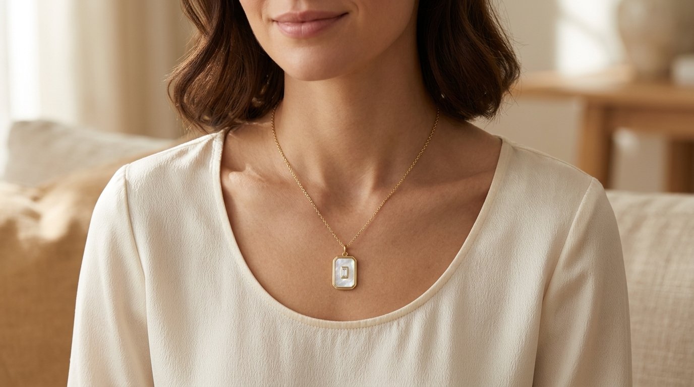 Elevate your everyday jewelry collection with the Luminous Mother of Pearl & Baguette Cut Pendant Necklace. This striking piece masterfully blends vintage-inspired geometry with modern elegance, making it a versatile staple for any curated wardrobe.