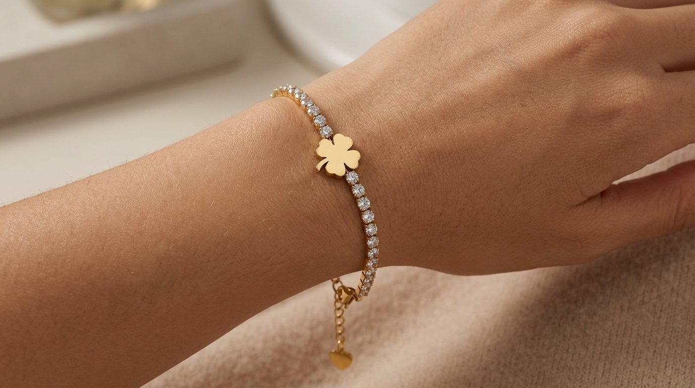 Elevate your everyday style with the elegant Clover Tennis Bracelet. This delicate piece features a continuous, sparkling line of clear stones meticulously set in a radiant gold-tone finish, offering a timeless look with a touch of modern charm. At its center lies a beautifully crafted four-leaf clover, a classic symbol of luck and prosperity. Designed for both comfort and versatility, the bracelet includes a secure lobster clasp and an adjustable extender chain, ensuring a perfect fit for any wrist. Whether worn alone for a subtle statement or layered with other favorites, this bracelet adds effortless sophistication to any outfit.