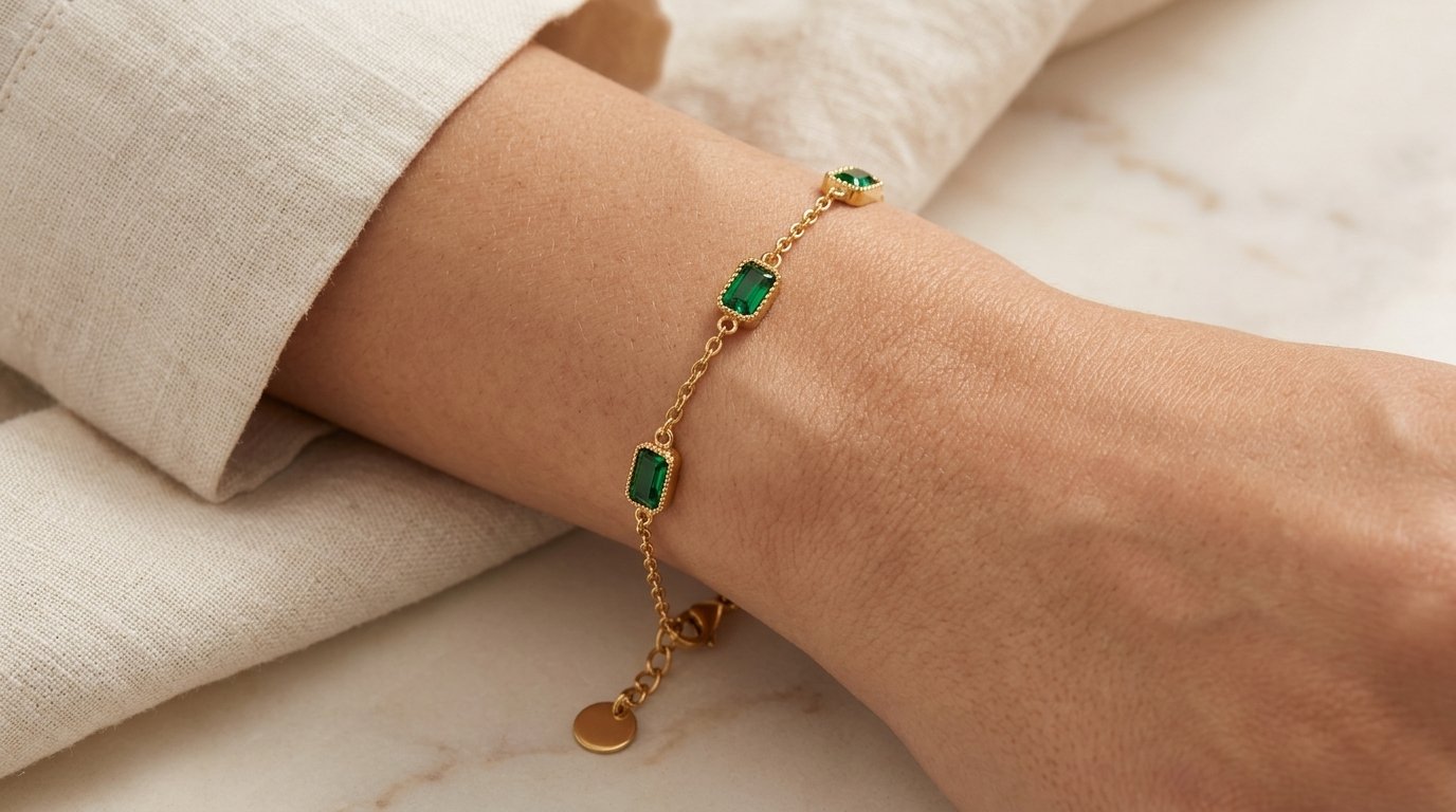 Adorn your wrist with the timeless elegance of the Emerald Radiance Gold Chain Bracelet, a piece designed to marry vintage charm with contemporary sophistication. This exquisite bracelet features five vibrant, emerald-green crystals, each meticulously cut into a classic emerald rectangular shape. These stones are cradled in delicate gold-tone bezel settings with intricate beaded detailing, adding a touch of artisanal texture. The sleek, adjustable cable chain ensures a perfect fit, while the polished lobster clasp and signature gold disc charm provide a secure and stylish finish. Whether worn alone as a statement piece or layered with other favorites, this bracelet brings a pop of regal color to any ensemble.