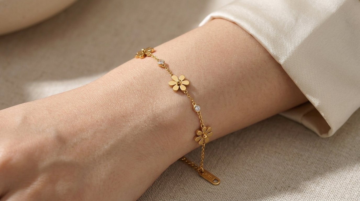 Elevate your everyday style with this exquisite 18K Gold Blooming Daisy & Crystal Chain Bracelet. Crafted with a delicate yet durable gold chain, this charming piece features three beautifully detailed floral motifs that bring a touch of nature’s elegance to your wrist. Interspersed between the golden blossoms are two sparkling, bezel-set clear crystals that catch the light with every movement. Complete with a secure lobster clasp and an adjustable extender chain, it ensures a perfect, comfortable fit for any wrist size. Whether worn alone for a minimalist look or layered with other favorites, this bracelet is a timeless addition to any jewelry collection.