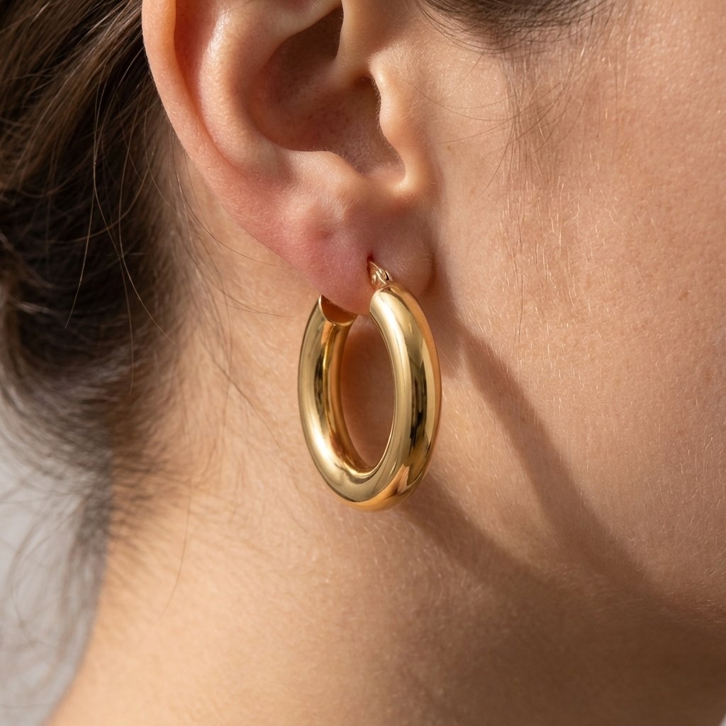 Elevate your daily style with the timeless elegance of our Aurelia Polished Gold Hoop Earrings. Expertly crafted from high-quality materials, these hoops feature a stunning polished finish that catches the light beautifully. Their substantial, chunky yet comfortable design offers a sophisticated look that pairs effortlessly with any outfit, from casual to formal. The secure click-post hinge closure ensures comfortable and confident wear all day long. A versatile staple for every jewelry collection, the Aurelia hoops are a must-have accessory that adds instant refinement.