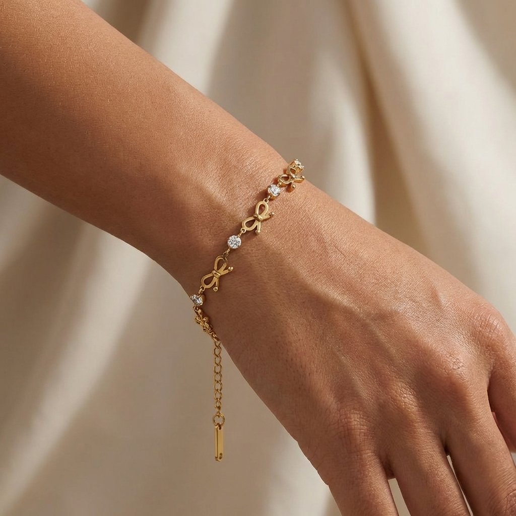 This exquisite 18k gold-plated bracelet features a series of intricately crafted bow charms interspersed with brilliant, round-cut crystals. The polished gold finish provides a warm, luxurious glow that beautifully complements the light-catching stones, creating a piece that is both feminine and sophisticated. Designed with a sturdy lobster clasp and an adjustable extender chain, it ensures a perfect, comfortable fit for all-day wear or special evening occasions.