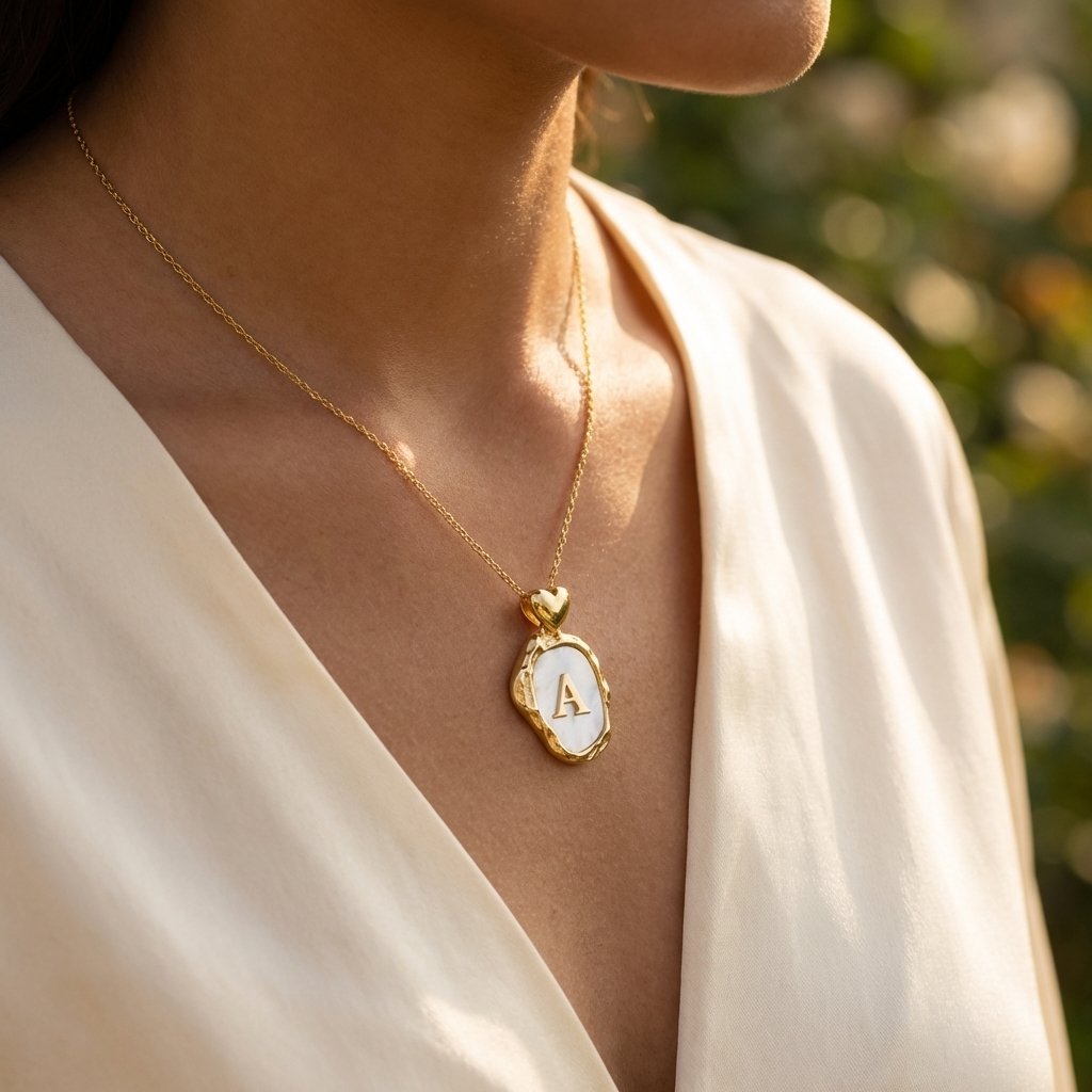 Elevate your everyday jewelry collection with this exquisite Golden Heart & Mother of Pearl Initial Pendant Necklace. Designed for those who appreciate personalized elegance, this piece beautifully merges classic, romantic charm with contemporary, organic textures. At the center of the design is a uniquely crafted, irregular-shaped pendant featuring a luminous, pearl-like inlay that softly reflects the light. Prominently displayed is a polished gold-tone letter “A,” providing a deeply personal touch that transforms the necklace into a meaningful, bespoke keepsake.