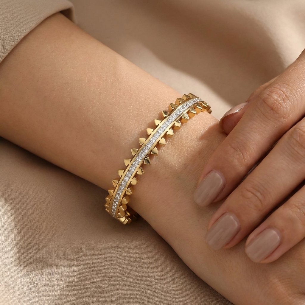 Elevate your wrist game with this meticulously crafted Golden Spiked Iced Bangle, designed for those who demand a blend of edge and elegance. Featuring a continuous row of shimmering pavé-set crystals flanked by polished architectural spikes, this piece catches the light from every angle while maintaining a sharp, modern silhouette. It is forged from high-quality materials with a radiant 18k style finish, making it the ultimate power accessory for stacking or wearing as a standalone statement.