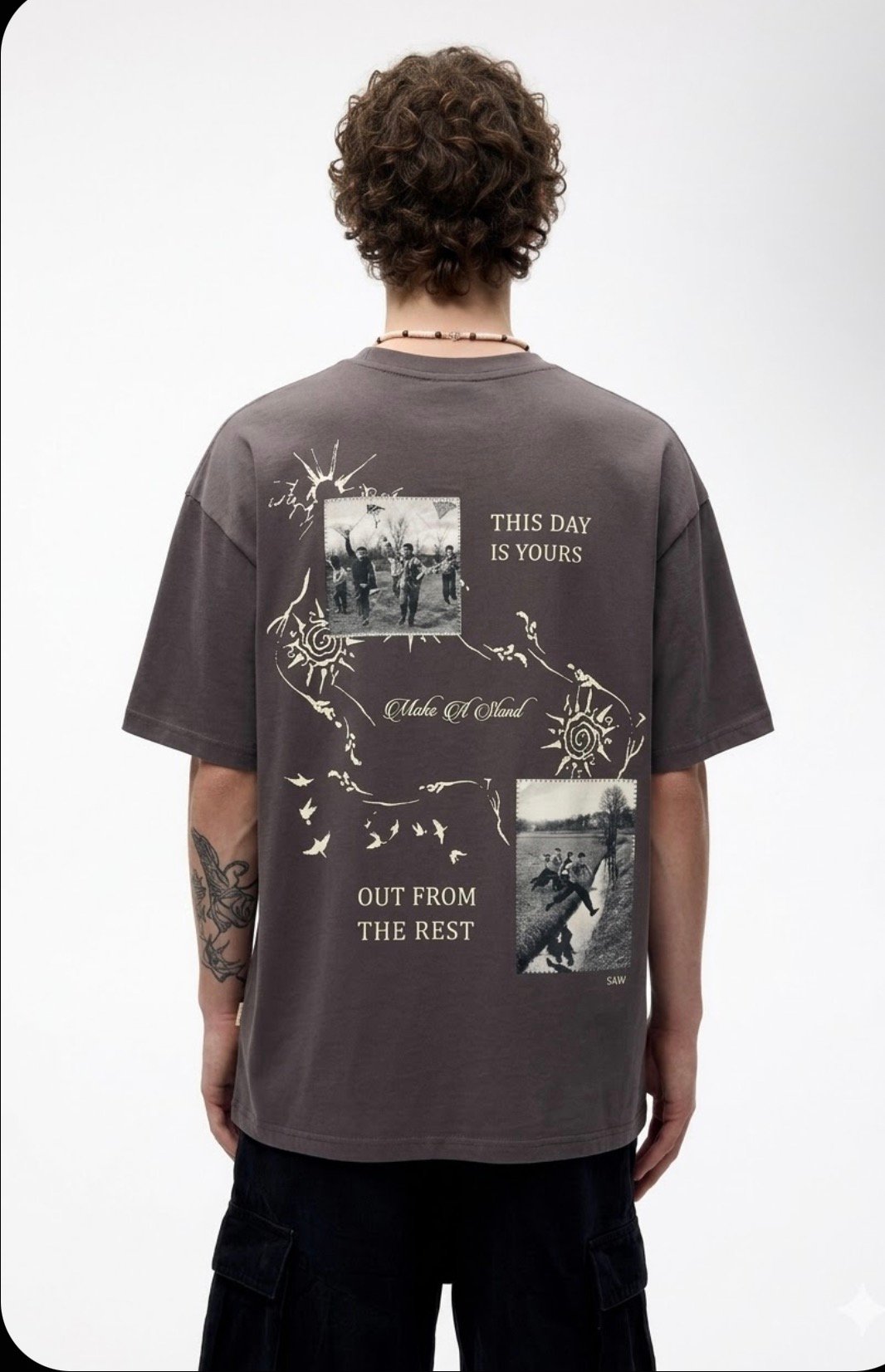 Fit: A modern boxier, drop-shoulder fit with mid-length sleeves, typical of contemporary streetwear.