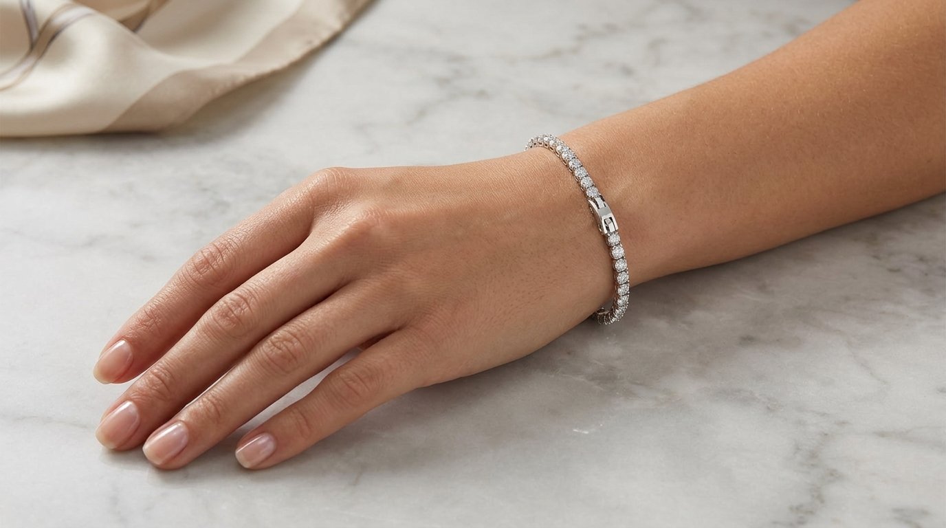 This exquisite tennis bracelet features a continuous row of high-clarity, round-cut stones designed to capture and reflect light from every angle. Crafted with a premium polished finish, the minimalist prong setting ensures a sleek, sophisticated profile that sits comfortably against the wrist. It is the perfect statement piece for high-end styling, offering a seamless blend of classic elegance and modern “iced out” brilliance for any occasion.