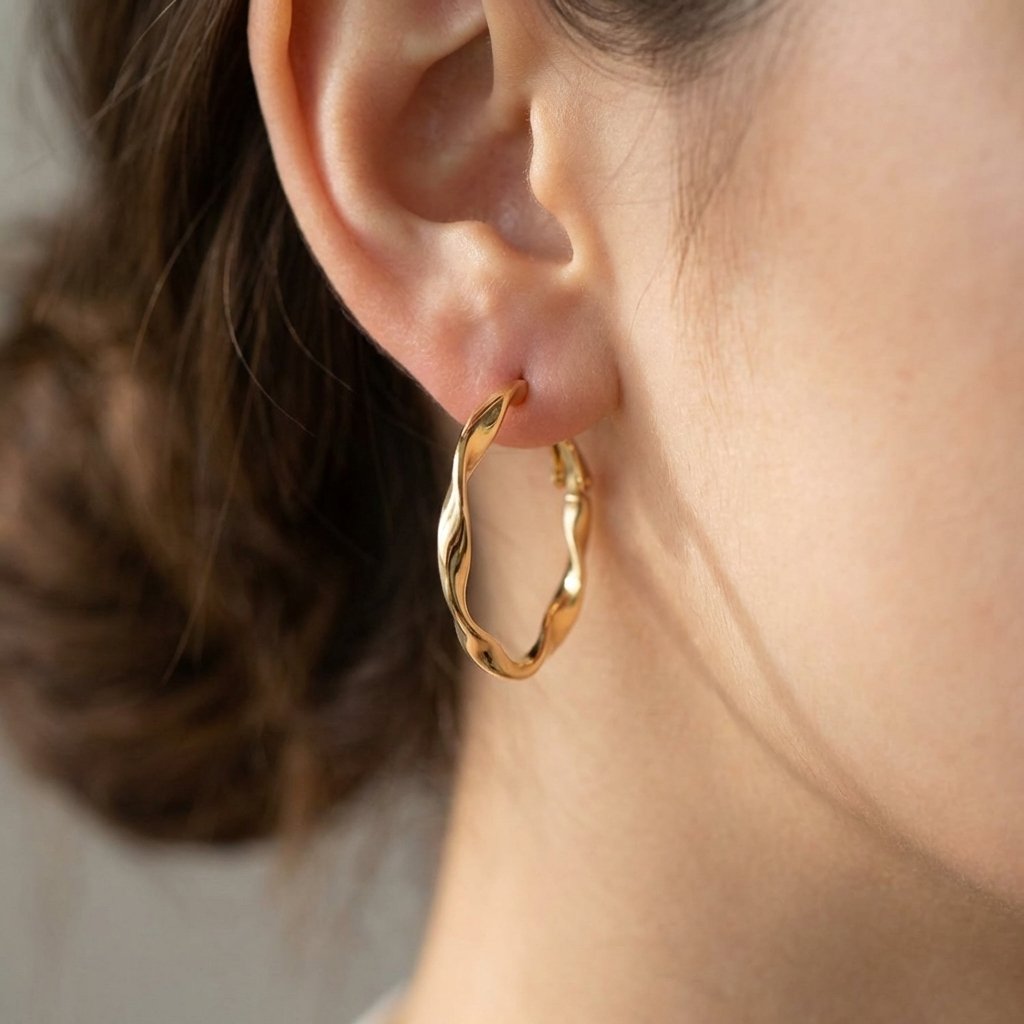 Elevate your everyday style with the Lumina Sculpted Gold Hoops. These stunning earrings take the classic silhouette and reimagine it with a modern, artistic twist. Crafted with a brilliant, high-polish gold finish, the wavy, ribbon-like design catches the light beautifully from every angle to create a fluid, dynamic look. The elegant, organic contour feels both refined and effortless, making them the perfect versatile accessory that transitions seamlessly from casual daytime wear to elegant evening attire. Featuring a secure closure for comfortable, all-day wear, these lightweight hoops bring a touch of contemporary sophistication to any jewelry collection.