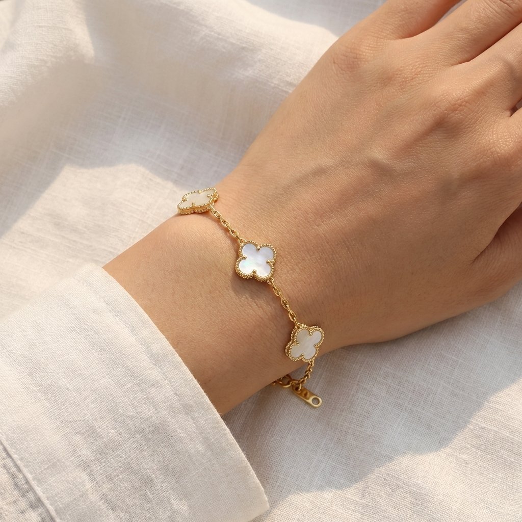Elevate your everyday style with this exquisite four-leaf clover bracelet, featuring five radiant mother-of-pearl motifs set in a delicate 18k gold-plated beaded border. The shimmering iridescence of the petals offers a sophisticated glow, making it a perfect statement piece for both casual layering and formal occasions. Crafted with a high-quality link chain and an adjustable extender, this bracelet ensures a comfortable, tailored fit for any wrist size.