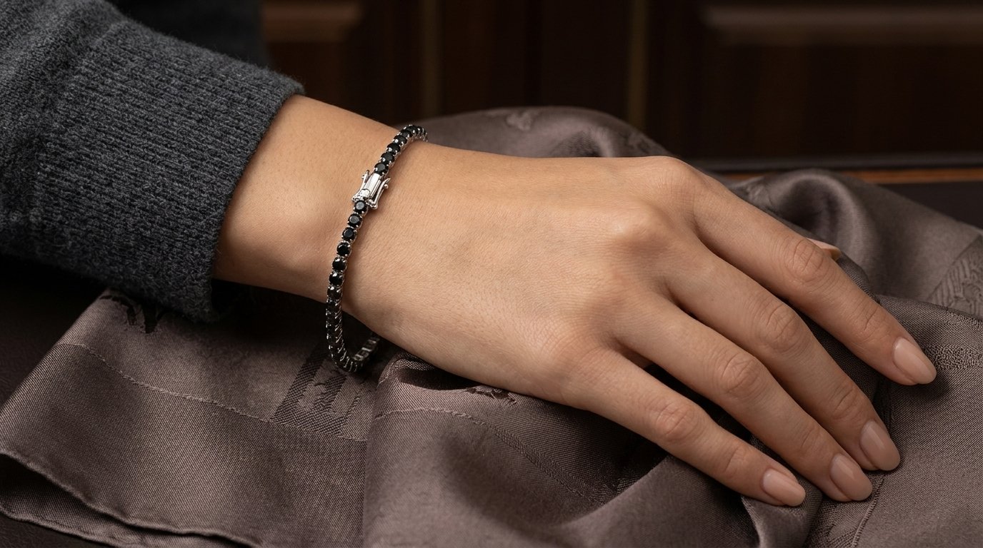 Make a bold statement with the Midnight Obsidian Tennis Bracelet. This exquisite piece reimagines the classic tennis bracelet silhouette with a striking, modern edge. Featuring a continuous, seamless row of deep, light-catching black stones meticulously set in a polished, silver-toned foundation, it offers an alluring contrast that transitions effortlessly from day to night. The sturdy and elegant clasp ensures the piece sits gracefully and securely on your wrist. Whether worn as a standalone statement or beautifully layered with your favorite watch, this bracelet embodies sophisticated glamour and timeless elegance for the contemporary jewelry lover.