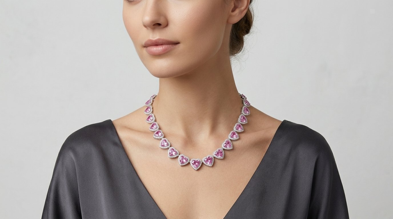 A brilliant, heart-cut pink gemstone tennis neclace featuring continuous micro-pave halos and a secure, hidden box clasp, engineered for statement styling and everyday luxury.