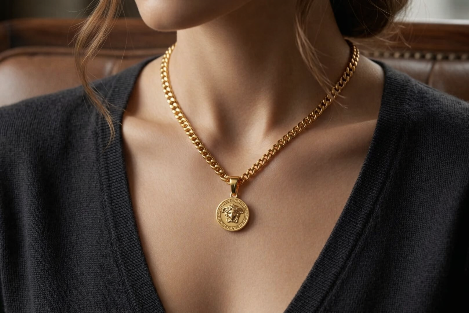 Elevate your everyday style with this exquisite Versace-inspired Medusa coin necklace, featuring a high-polish gold finish that captures the light from every angle. The pendant showcases the legendary Medusa emblem encircled by a traditional Greek Key border, symbolizing timeless luxury and bold sophistication. Suspended from a sturdy, refined link chain, this piece serves as a versatile staple for both minimalist layering and standout solo wear.