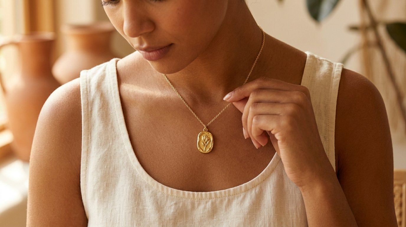 Embrace timeless elegance with this beautifully crafted Gold Rose Pendant Necklace. Featuring a delicate, vintage-inspired oval charm, the pendant showcases a stunningly detailed, embossed rose set against a softly textured background. The romantic design is framed by an organic, uneven border that adds an artisanal, handcrafted touch to the piece. Suspended from a sleek, fluid gold-tone snake chain, this necklace drapes gracefully along the collarbone, catching the light with every movement. Whether worn as an everyday signature piece or layered with other delicate chains for an evening out, this necklace brings a touch of classic romance and sophisticated charm to any outfit.