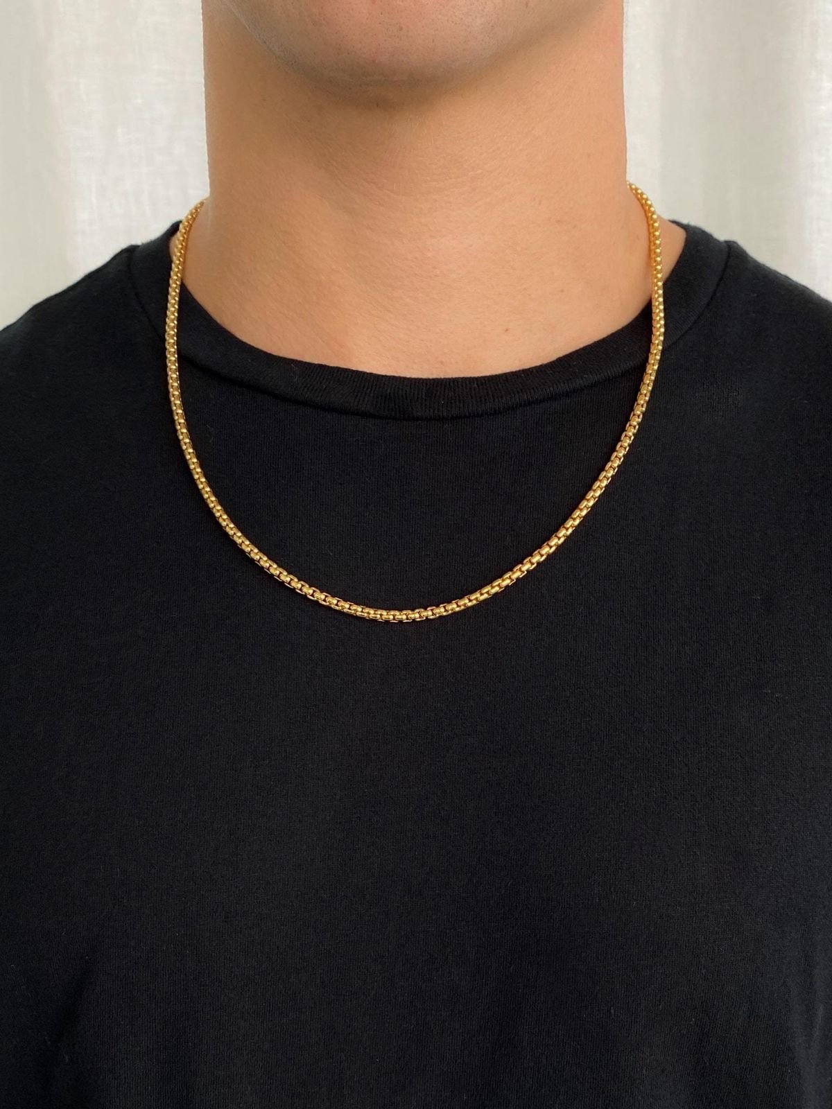Elevate your daily attire with the sophisticated shimmer of our Vortex Venetian Gold Chain. This unisex piece features intricately crafted, interlocking box-style links that catch the light from every angle, creating a rich, fluid texture. Plated in luxurious 18K yellow gold over premium brass, it offers a durable and high-quality finish. Its medium gauge and classic length rest perfectly at the collarbone, making it an ideal choice for standalone wear or for layering with other favorite necklaces. Perfectly paired here with a minimalist black tee, it effortlessly transitions from casual daytime looks to elegant evening styles. A timeless staple for any modern jewelry collection.